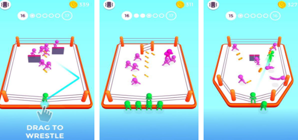 比起现实风的摔跤,玩家将在比较抽象的简洁页面中实现队伍之间的摔跤。每一场PK会有两个不同颜色的队伍,大多数以绿色和紫色为主,分别在一个长方形那台的对立面。摔跤关卡中的障碍物有所区别,既可以是不透光的挡板,玩家还会放置一些用绳子相连的栏具。玩家战胜所有不同颜色的摔跤手就会赢得胜利,最后结算时会撒花哦。