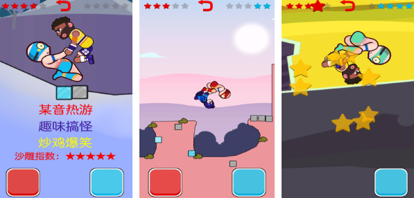 摔跤角色自带搞笑风格,玩家可将动画角色以及大叔萌化后的角色进行摔跤PK。摔跤过程的沙雕感比较足,这无不得益于摔跤动作的施展,PK的两个角色的腿部是存在动作限制的,玩家只可以通过调整方向来对对方进行攻击。摔跤的场景比较多变,可以是自带陷阱和一些坑的关卡。