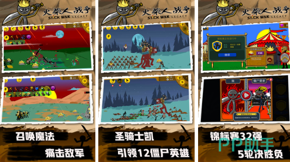 在这款火柴人主题的策略手游里,我们可以体验到无尽僵尸模式这种刺激的玩法!面对源源不断的僵尸大军,甚至有一些超巨大的僵尸威力无穷,我们只能不断派出火柴人战士,去对抗他们!而你的兵种是由你来选择的,可以是射弓箭的火柴人,也可以是拿着刀剑和盾牌的火柴人近战战士。如果你想要证明自己的实力,可以去参加锦标赛哦!
