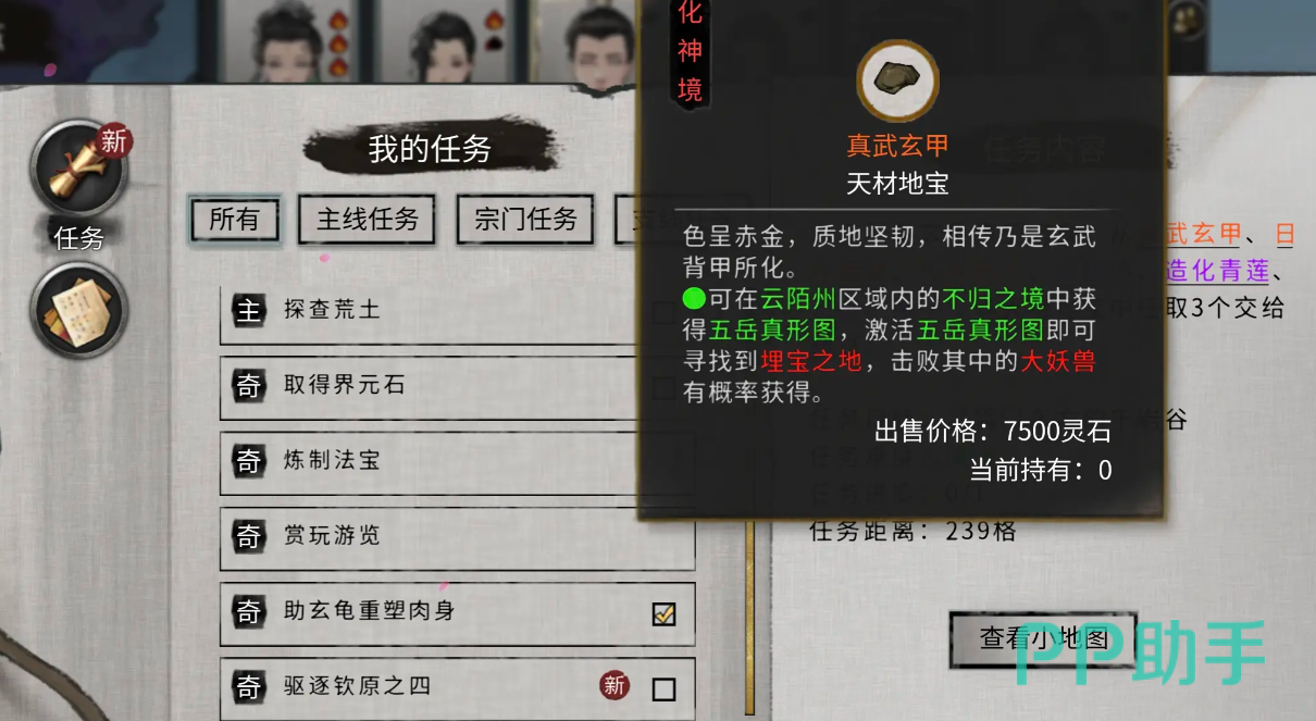 有了神魂这一材料还不过,我们还需要通关不归之境,不归之境会随机刷新在地图上的各个位置,击败里面的阵眼即可获得五岳真形图,获取后再真形图中注入灵石即可查看到隐藏大妖的所在位置。