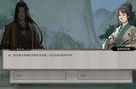 首先进入村庄会有直率的村民和我们说自己的院子中有两缸衣服还没洗,这时会跳出来洗衣和劈柴的两个选项,选择洗衣服的话全灵气资质+15,选择劈柴的话全武力资质加15,如果大家想要增强武力就选劈柴,想要快速增长自己的修为就选洗衣服。