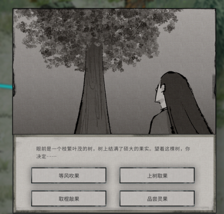 等我们走到一棵结满果实的树下面,这时有四个选择,第一个等风吹果能让自己的风、土、木这三种资质全部提升20,选择上树采果的话能让拳、掌、指资质加20,选择取棍敲果会让刀、枪、剑资质加20。