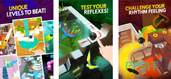 这是款将小球滚动和音乐互动玩法进行结合的神奇手游,游戏中的小球会在不同的主题地图上进行滚动冒险,你需要根据BGM的节奏尝试点击屏幕控制小球向不同位置滚动,只要大家能够灵活掌握节奏就可以让小球在关卡中自由冒险,主题场景立体生动而且小球滚动的动态效果也十分真实。