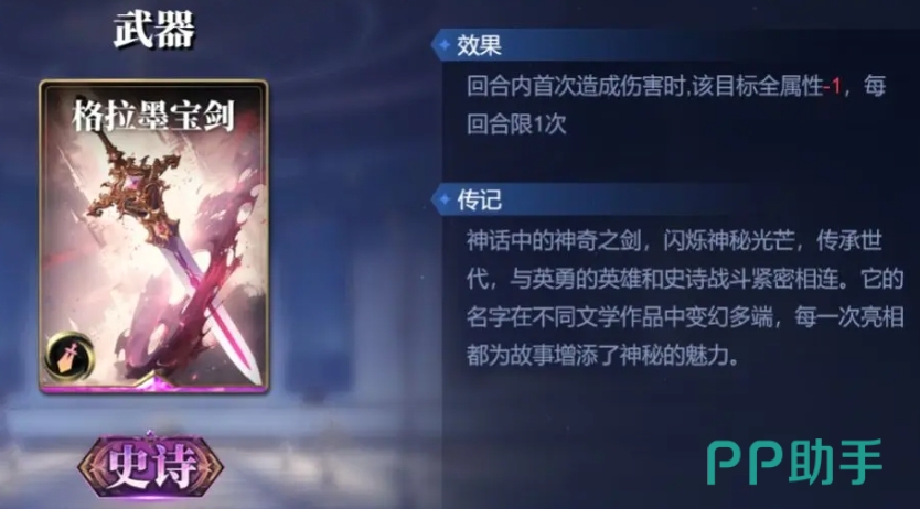 需要注意的是,发动后该宝物会销毁,而且需要智力达到7点才能使用,最后一张推荐大家用武器卡格拉墨宝剑,这把宝剑拥有独特的能力,在回合内首次造成伤害时,可以使该目标全属性-1,值得注意的是,雅典娜的智谋神威技能造成的伤害也可以触发这一效果,所以通过这些卡片的组合使用,可以有效地削减对手的属性,使对手的智力不高于雅典娜,从而封锁掉对手使用技能构筑卡的可能性。