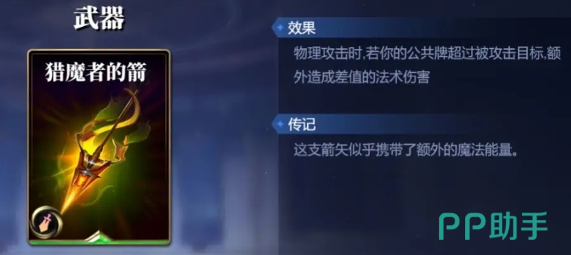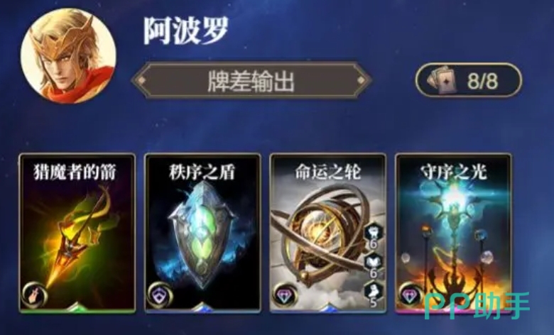 他利用自身独特的两个技能暗中交易与预言,可以巧妙地控制并消耗对手的手牌资源,同时为自己积累更多的选项,阿波罗的核心输出是可以选用猎魔者的箭,这张卡能在拉大牌差后,根据双方手牌数的差距对敌方造成额外的法术伤害,因此持续扩大手牌优势对阿波罗至关重要,而秩序之光则是一张能够提升阿波罗手牌上限的关键卡牌,它进一步帮助阿波罗巩固其手牌数量上的优势。