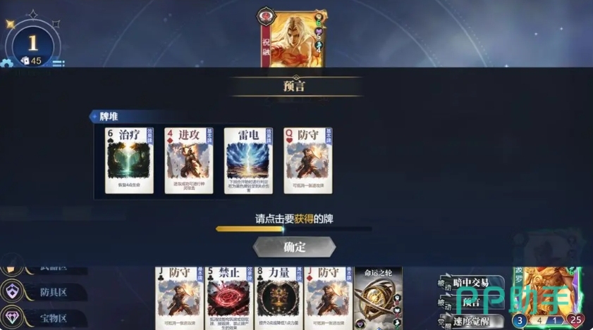 阿波罗拥有两项独特的被动技能,使得他在摸牌阶段能够灵活应对各种情况,首先暗中交易技能允许他在摸牌时做出一个策略性的选择,少摸一张公共牌,而是从其他目标那里获取一张公共牌。这个技能不仅增加了阿波罗手牌的多样性,还可能打乱对手的计划,为阿波罗带来战术上的优势,另一个技能预言则更加侧重于信息的收集和控制。