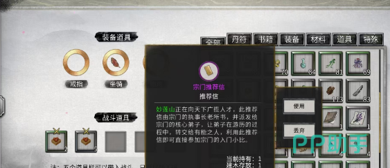 在加入到宗门时,除了需要灵根还有修为之外,其中还有一个关键的道具,这就是推荐信。有推荐信加入到其中就会变得比较简单,而且一开始还会有少量的贡献,可如果没有推荐信的话,那么就只能通过比试任务加入到其中。