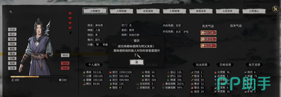 好感度则是拜师成功的核心保障。虽然拜师没有硬性的好感度要求,但在“魅力值”和“性格”都符合NPC期待的前提下,好感度至少需要达到四星以上,成功率才会显著提升。提升好感度的方法多种多样,其中最直接的方式便是赠送礼物。不同NPC对礼物的喜好各有不同,道友需要根据NPC的性格和兴趣选择合适的礼物。例如,正道NPC通常偏爱正义属性的物品,而邪道NPC则更倾向于接受邪道相关的珍稀资源,与目标师傅多次互动,完成其发布的支线任务,也能快速提升彼此的关系。