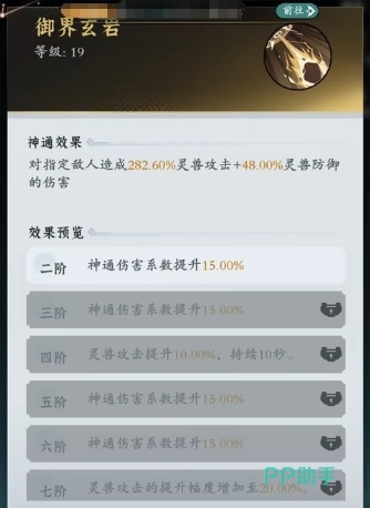 灵兽有三个神通,激活条件通常为灵阵境界达到特定等级或灵魄数量达到一定数值。神通可以通过开灵露和点化玉来提升,而这两种材料也可以在灵缈界中获得。每提升10级,便能解锁不同的效果。