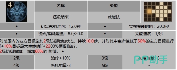 到了3级,移除增益状态的概率将增加25%,使得这个技能在控制敌人方面更加有效,而4级时充能时间将减少2秒,除了一点报复,伊胡卡特的大招初始充能时间为12.0秒,完整充能时间为20.0秒,一旦释放,它会对范围内的友方目标施加2级的防御增加状态,持续10.0秒,对于生命值低于50%的友方目标,这个技能还将提供相当于其最大生命值10%以及2200%领悟的治疗效果。