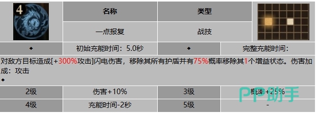 一旦释放这个技能将对敌方目标造成相当于其攻击力300%的闪电伤害,同时移除目标的所有护盾,并有高达75%的概率清除其一个增益状态,值得注意的是,这个技能的伤害加成是基于攻击数值的,使得它在战斗中具有极高的爆发力,随着技能等级的提升,一点报复的效果也会得到增强,在2级时,伤害会增加10%,进一步提升了其在战斗中的输出能力。