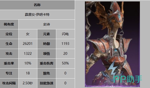 伊胡卡特在游戏中属于史诗级别的角色,也就是一张紫卡,另外的称号是霹雳女,龙息神寂伊胡卡特怎么样就研究一下,看她的效果是在哪里吧,主要体现在电系辅助效果上,防御光环是队长技,可以在所有战斗中为所有友方目标提升24%的防御力,在比较需要高生存效果的对战中,这个队长技能绝对是好用的。