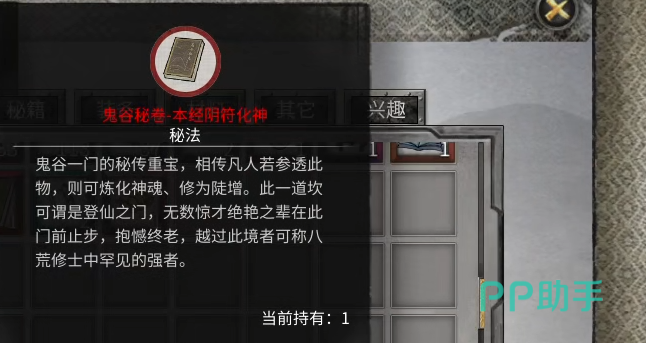 其实这个秘卷就有点像是传统RPG游戏里的经验书,或者说是突破材料。在游戏更新化神悟道版本的时候新增了“鬼谷秘卷”,它是鬼谷门派的秘宝,可以将其理解为突破秘籍,使用后可以突破化神境界。