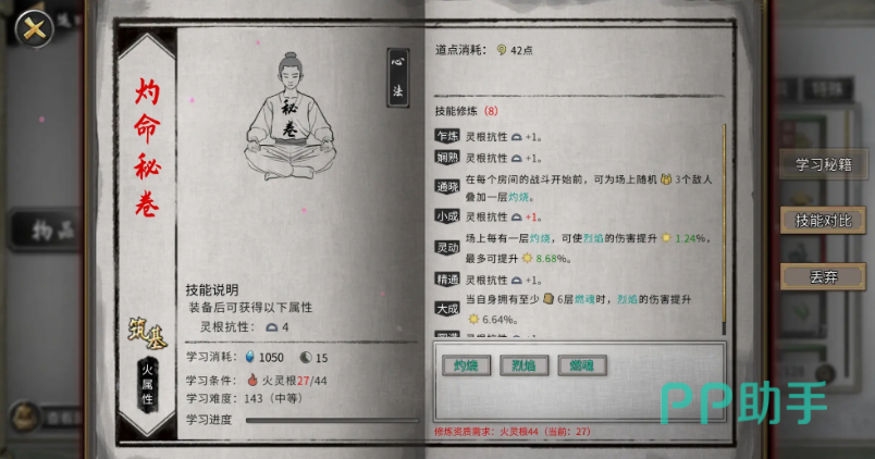 再就是“灼命秘卷”,满足一定的灵根要求后消耗资源可以习得,提升灵根抗性,每次入战就可以给敌人挂灼烧,场上敌人有灼烧的时候可以给自己增伤。