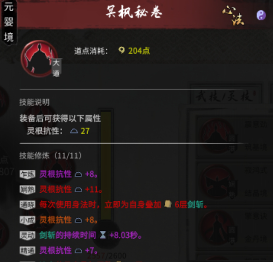 除了鬼谷秘卷这种偏向于任务和突破材料的道具外,还有不少其他种类的秘卷,例如“冥枫秘卷”,效果是提升灵根抗性,每次使用身法的时候叠加剑斩,场上没有一层流血可以提升自身的伤害。
