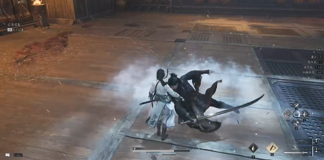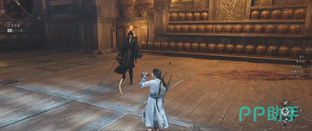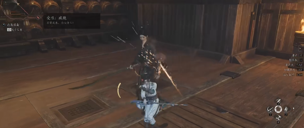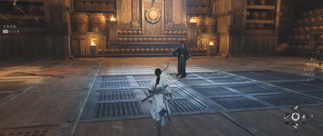 将主线推进到离开金明池这里,大家就会进入到船舱当中,就会遇到容鸢这个BOSS了,此时会于她的第一形态展开战斗,第一个形态就是人形,拿剑的黑衣女子的形象,此时容鸢会不断对角色进行灵魂拷问,主要使用长剑对角色展开攻击。