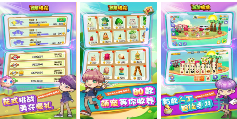 蔬菜接龙是个与果蔬相关的卡牌接龙休闲类游戏,将消除玩法与纸牌接龙元素的结合给人耳目一新的感觉,一共五百多个难度不同的接龙关卡等待着玩家挑战,各种造型的可爱萌宠也期待着大家收养并陪你一起接龙冒险,乐趣十足的内容和休闲佛系的气氛塑造都是这款接龙游戏的亮点,爱玩休闲果蔬接龙手游的小伙伴快点安装尝试吧。