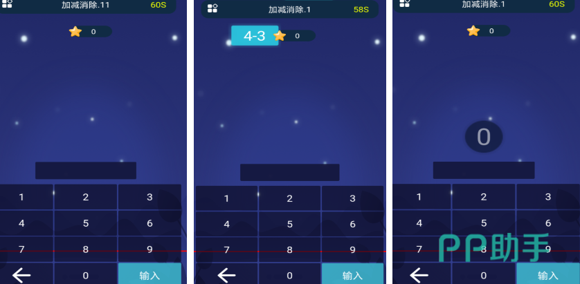 背景主题可选,玩家将在深蓝以及更多纯色背景下完成加减消除挑战。在玩法过程中,每一个等式回答正确后会得到一颗星星,每一关卡中出现的等式数量是一定的,没有时间限制,玩家只需保证加减乘除运算的正确率即可。消除相对于加减说比较难,玩家可以暂停思考后再输入答案。