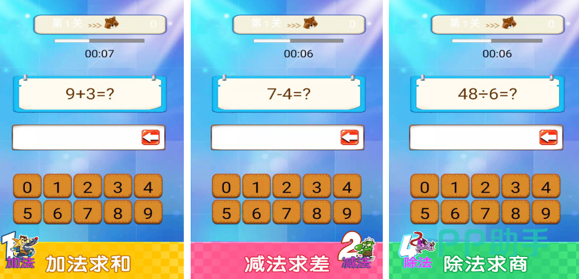 在卡通页面中,玩家在关卡的规定时间内完成出现在页面的各个算式。大多数算式都比较简单,玩家只用使用一次运算法则,得到了答案后直接点击下方提供的选项卡片即可。每一关卡中的时间是固定的,玩家的速度越快,回答的算式数量越多,最后得到的分数就会越高哦。