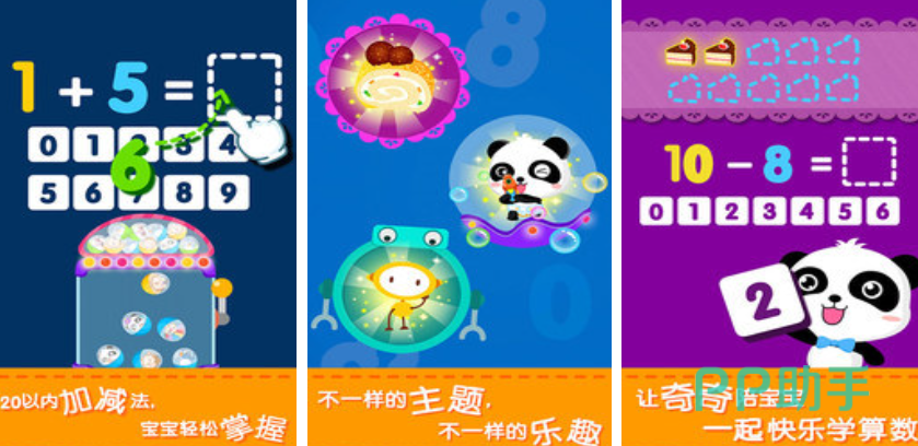 对于宝宝小朋友而言,二十以内的加减法难度并不高,玩家在算出等式的结果后,把下方提供的数字移动到等式的末尾的方框中,等待系统给出判定结果即可。主题元素比较丰富,每一个带有加减运算的关卡中会随机出现小猴子等多个动物,有时候还会有小朋友喜欢的大熊猫。
