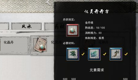 在炼制前,大家需要先做好准备工作,准备工作的关键就是根据化灵丹的配方把灵药给收集齐全了,化灵丹配方中需要用到灵药种类和数量都比较多,只有每一种灵药都给收集齐全才能正式开始炼丹,化灵丹需要准备50个荨苎麻、40个极寒鱼尾草50个千露以及40个山参。