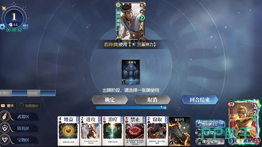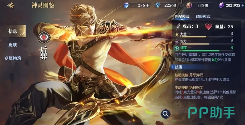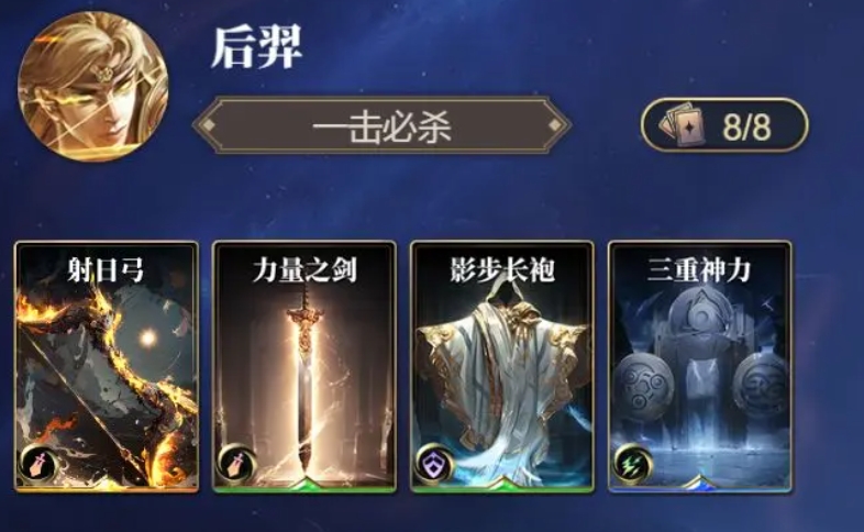 在进攻成功后,只需使用一张手牌即可造成1点连击伤害加上3点射日弓的额外伤害,也在一定程度上面提升了输出能力,此外,后羿使用时还能额外获得1张公共牌,在持续作战能力方面也是提升效果的,当然为了弥补绝日归尘这个技能的高属性消耗,大家也可以选择携带力量之剑、防具影步长袍以及速度宝石,其中的力量之剑在进攻成功时可以提升两点力量属性,而影步长袍和速度宝石则分别用于提升速度属性,三重神力更是能全方位提升两点三维。