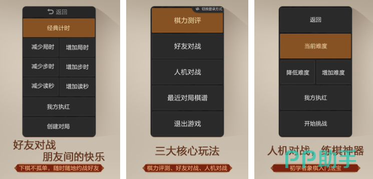《大师象棋》依旧是以中国古代象棋玩法为基础,游戏的界面也设计古香古色,是一款集合了休闲、竞技和益智为一体的手游。有真人对战、好友对决和残局破解等多种玩法。游戏内环境公平,匹配时等级设定非常严格,绝对没有高手碾压新手的情况。倘若不喜欢游戏内也有皮肤的设定,也可以自由更改棋盘和棋子的颜色,自由度非常高!