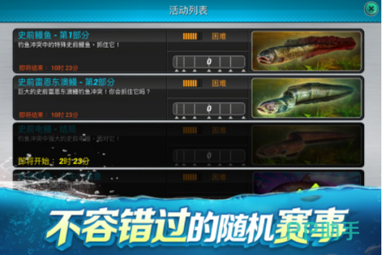一款寒冷季节才会举办的钓鱼赛事,当周围特别寒冷,湖面上冻结之后闪耀进行冰钓,完全可以通过温暖的帐篷搭建来体验冰钓。在游戏里最开始只会解锁比较普通低级的鱼类,可供玩家选择,而且它们即使被吊起来,获得的积分也很少,不过随着玩家的钓鱼实力强大之后,很多比较稀有的鱼类也会随着钓鱼技术的精湛,而逐渐被解锁。