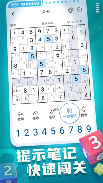 9宫格数独游戏让玩家能欢乐体验数独游戏所带来的精彩感觉,每一次的数字挪动都是一次全新的尝试,将数字按照规则进行碰撞融合以后的结果令人心生成就感,越玩越觉得很兴奋,还有轻松的配乐和舒适的清新背景图,让玩家感受起来减少了很多压力,在不断解谜数独的过程中可谓是收获满满了。