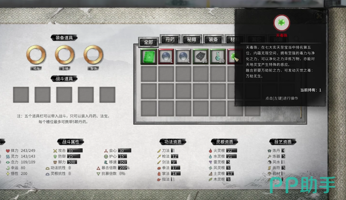 随后,玩家可以根据这些丹方的提示,寻找到丹药所需的各类材料,值得一提的是,在本传当中,实际上是不允许玩家炼制属性词条为邪恶的丹药,这一类丹药不仅会折寿,对玩家也没有任何的好处,而在逆天炉鼎当中,玩家可以使用八荒之中毒性最强的药材,炼制成毒丹,最终将它赠送给某一个NPC。
