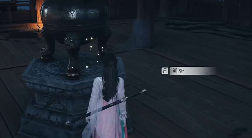 进入钟楼后,先环顾一圈,很快你会在一根石柱上发现一道刀痕。这不是普通的砍痕,而是一道带着寒气的“凌厉刀痕”。调查后,别忘了记录下来,继续探索。接着往深处走,你会在墙上和门板上发现数枚柳叶镖。这些暗器显然不是普通人能用的,镖头上隐约还能看到暗红的血迹。调查它们之后,线索逐渐清晰起来。
