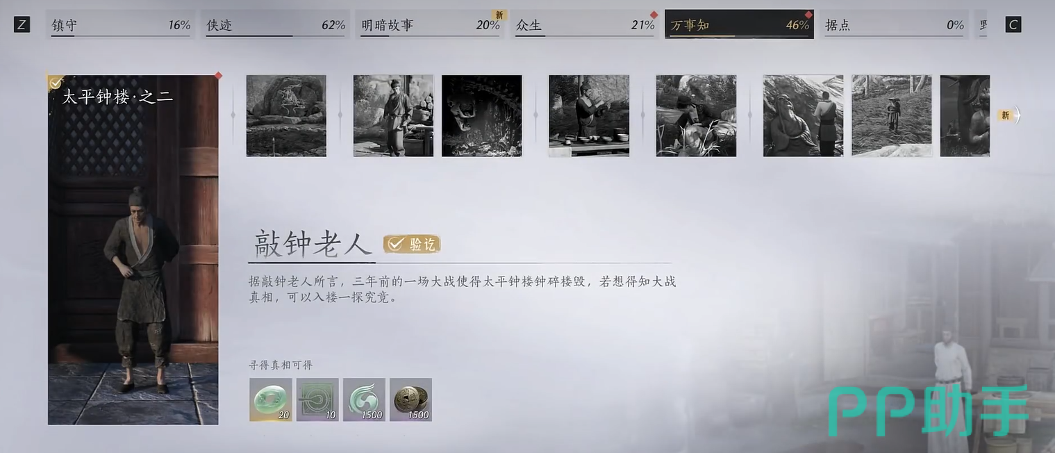 首先,打开地图,标记“太平钟楼”。我们的目标就是这个满是岁月痕迹的破败建筑。在楼下,你会发现一个衣衫褴褛、颇有故事感的NPC——敲钟老人。走上前对话,他会和你讲述一场三年前的惊天大战,以及那次战斗如何将这座钟楼摧毁得支离破碎。他说得很隐晦,但想知道更多,还得我们自己进去调查。