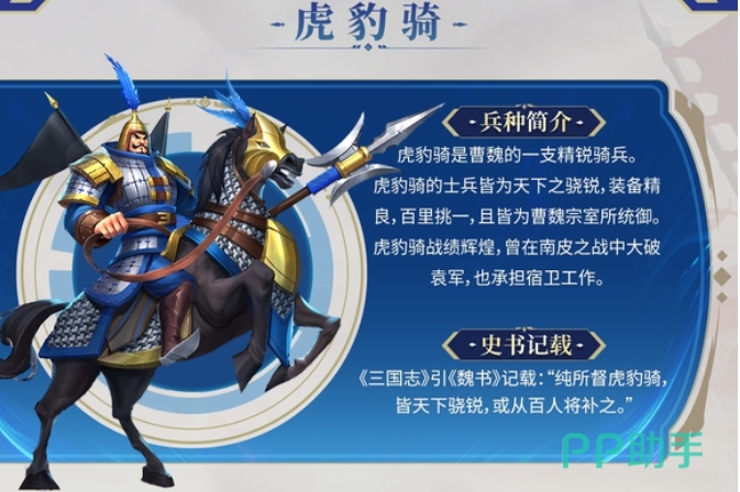 虎豹骑:这是曹魏的一支精锐骑兵部队,虎豹骑的士兵皆为天下之骁锐,装备精良,百里挑一,而且这支部队皆由曹魏宗室所统御,可见其在曹魏军中的地位之高,虎豹骑战绩辉煌,曾在南皮之战中大破袁军,也承担着宿卫工作,是曹魏军中的一支重要力量。