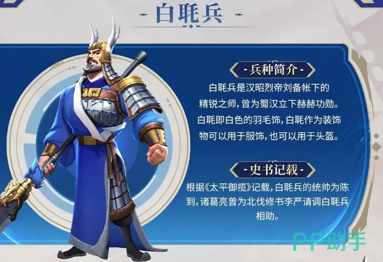 白眊兵:是汉昭烈帝刘备帐下的精锐之师,这支部队曾为蜀汉立下赫赫功勋,是刘备手中的一张王牌,白眊即白色的羽毛饰,作为装饰物可以用于服饰也可以用于头盔,白眊兵以其独特的装束和出色的战斗力而闻名于世,是蜀汉军队中的一支重要力量。