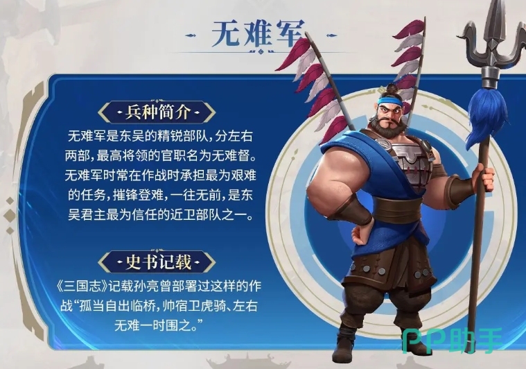 无难军:是东吴的精锐部队之一,这支部队分为左右两部,最高将领的官职名为无难督,无难军时常在作战时承担最为艰难的任务摧锋登难、一往无前,他们是东吴君主最为信任的近卫部队,也是东吴军队中不可或缺的一部分,无论是攻城略地还是保卫家园,无难军都能够勇往直前、毫不退缩地完成任务。