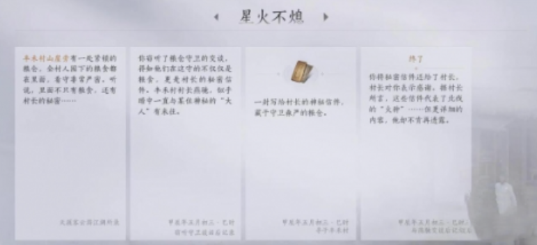 燕云十六声星火不息攻略已经介绍完毕,其实玩家主要就是获得宝箱,拿到秘密的信件以后,将秘密的信件直接交给npc,这时候就代表任务已经完成,当玩家或完成任务之后就能够拥有奖励。