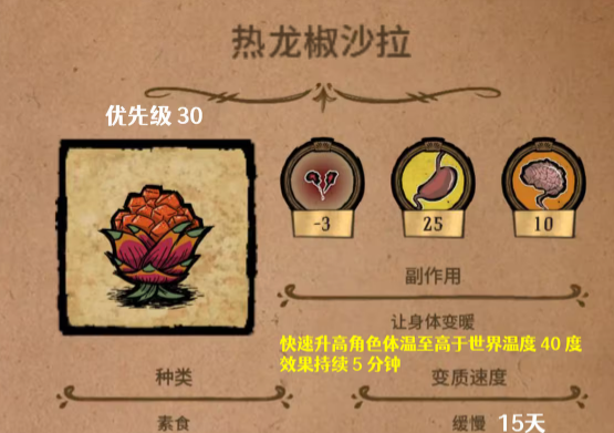 辣龙椒沙拉:所需要准备的材料是三个辣椒,还有一个火龙果,在制作的时候不能放肉和蛋,外观看上去真的非常的漂亮。在使用之后虽然会导致血量减少三点,但是可以获得10点精神值,还有25点血量。同时还可以在持续一天内让身体保持暖和。