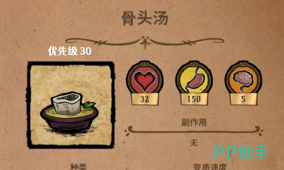 骨头汤:需要准备一个洋葱,还有两个骨片,在食用之后可以增加32点血量,还有150点饱食度,在吃完之后不存在任何的副作用。