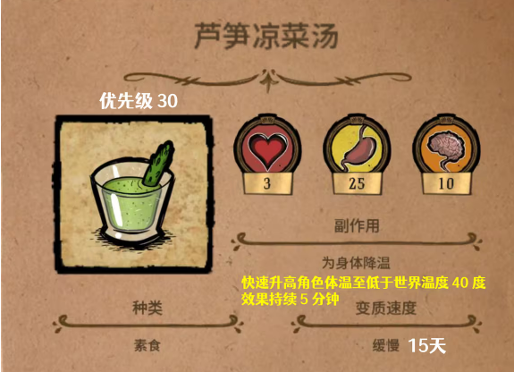 芦笋冷汤:应该准备两个冰,还有两个芦笋,一旦在食用之后就可以获得10点精神值,25点饥饿值,还有三点生命值。但吃完之后就会让身体感觉到非常的冷,持续5分钟内温度都会降低。