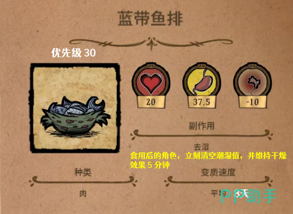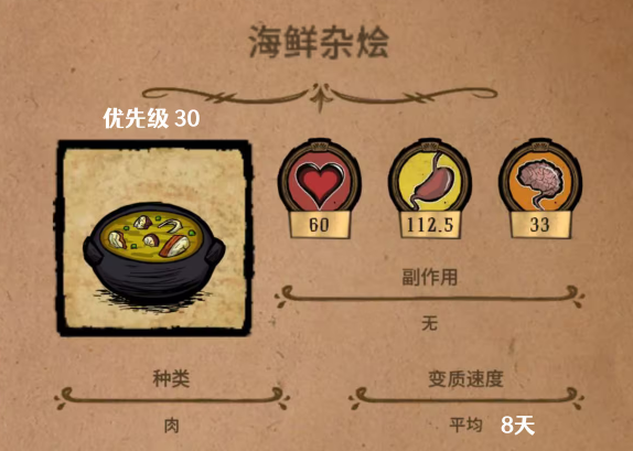 海鲜杂烩:里面所包含的原材料非常的丰富,例如有一个洋葱,一个番茄,还有两个鱼。制作的时间是非常慢的,但是在吃完之后可以获得33点精神值,60点血量,还有112.5的饱食度。