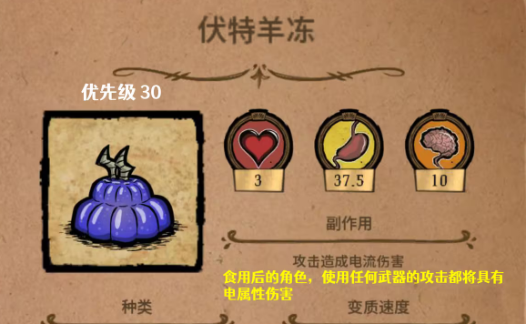 闪电羊肉冻:需要三个蜂蜜,还有一个伏特角。可以暂时的增加电击的伤害,所造成的伤害数值还是非常高的。