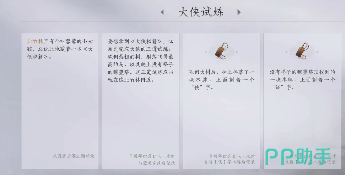 完成射杀以后展开地图会发现清河百草轩有一边隐藏的丛林,这就是探索目标,之后来到这边隐藏的地方会看到一座瞭望台,瞭望台四处附近都素各种各样的零件,玩家们将这些零件全部收集,之后会回到任务地点的凉亭,此时在跟npc蓉蓉进行对话,这个任务就完成了。