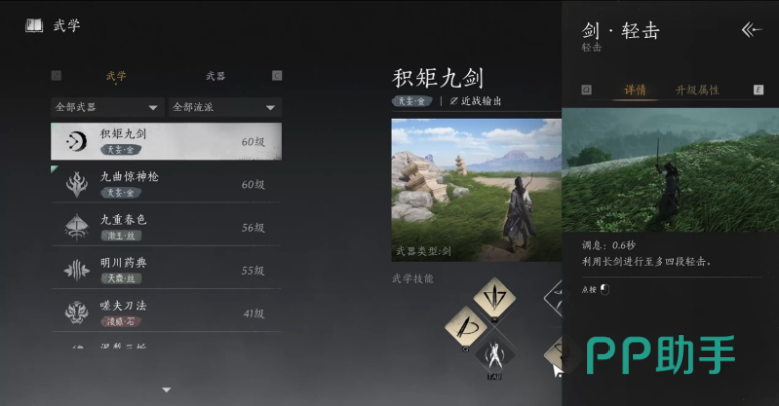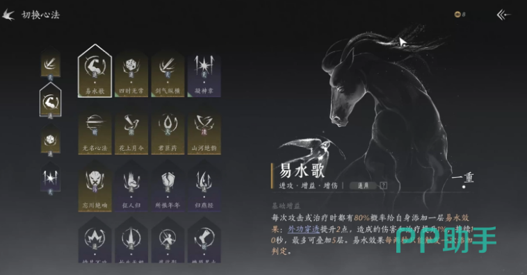 功法有三类,武学,心法,奇术。先看武学,这是在与对手战斗时使用的一些招式,主要的运用环境就是打架。心法的作用就是让武学能发挥出更大的威力,或许是提高武学的输出伤害,又或许是让角色更肉,当然也能让治疗角色的奶量更为充足,萌新比较推荐明川药典+无名剑,可带易水歌以及四时无常的通用心法,后续可根据情况随时更换的。