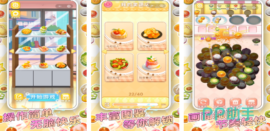 您开局后将会沉浸在色彩缤纷的水果当中,通过消除以及闯关的元素完成相应的要求。在屏幕中会不断涌现出各种类型的水果,而玩家只要将三个相同类型的水果放在同一个水果碟当中就能顺利完成消除,只要将所有水果全部消除之后,就能顺利完成闯关。同时不光能解锁更多有趣的道具,也可解锁全新的菜品。除了经典的消除玩法以外,还融入了连击的机制,必须发挥自己聪明的头脑,完成挑战。
