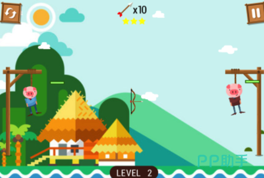 拯救小猪仔是个画风搞笑且操作特殊的休闲闯关游戏,每个关卡都有几个正在上吊的小猪等待大家解救,解救的方式就是发射弓箭射断上吊绳,别具创意的解救小猪玩法与卡通魔性画面相得益彰,操作很容易但是需要大家把握时机发射箭矢,每一关给大家提供的箭矢熟练都是有限的,大家要在箭矢耗空之前拯救可爱的猪崽哟。