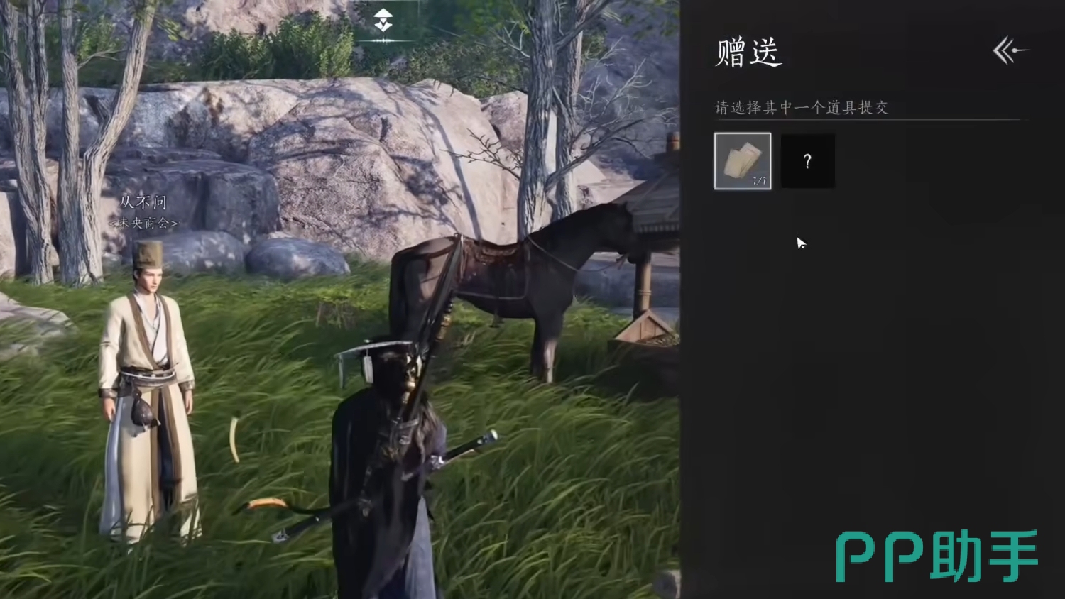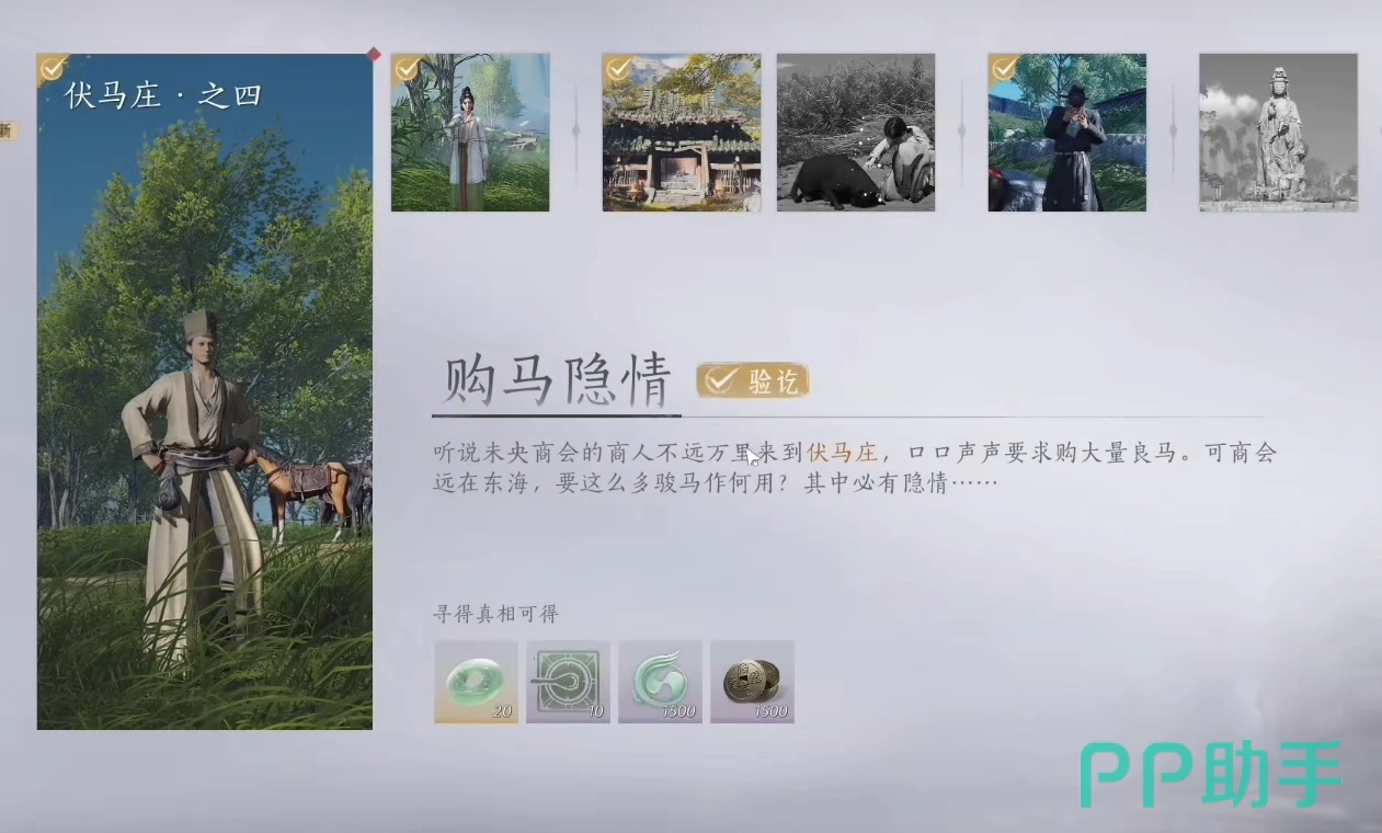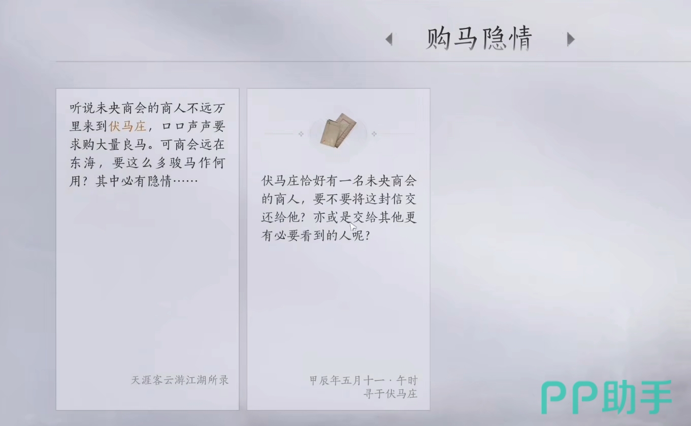 该任务是需要人们主动去进行触发的一个任务,并且会根据玩家们最后提交任务时的选择,来产生不一样的结局。首先,玩家们先通过传送来到伏马庄,通过未央商会的丛不问获得该任务的线索,知晓他此次来伏马庄是为了买马。
