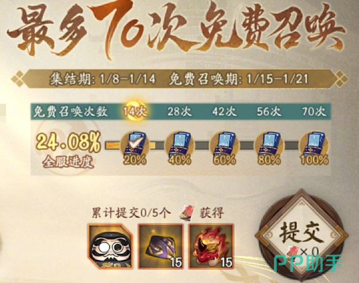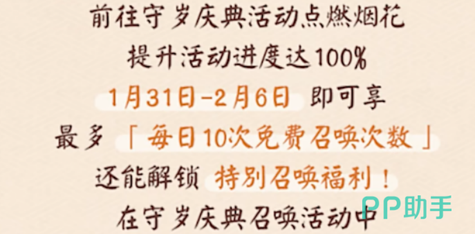 不仅如此,玩家上缴的“福”还将推动全服的活动进度。只要全服进度达到目标,1月15日维护后就会解锁“祈福庆典”活动。在祈福庆典期间,玩家每天都可以获得最多10次免费召唤,而且保底必得SSR或SP式神。这一阶段简直就是福利大放送,不需要勾玉、不需要蓝票,靠免费召唤就能白嫖SSR/SP,真正体验新年开门红的美妙感觉。
