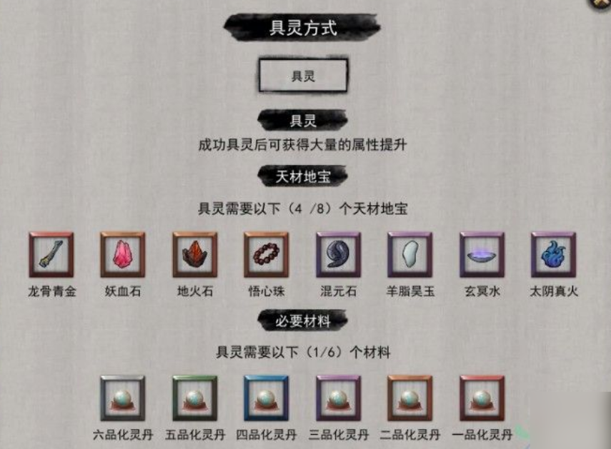 除了化灵丹之外,还需要准备羊脂昊玉(或羊脂灵玉)、龙骨青金、地火石、混元石、妖血石、玄冥水(或玄明水)、太阴真火、悟心珠这8种材料,其中的龙骨青金需要打败十万大山中一个名字叫做苍魂冥蛇的boss才能获得,其余的7种材料都需要找到三个残破封魔阵,然后通关副本才能够拿到。在残破封魔阵中,一共需要消耗15个4品灵果才能开启副本。