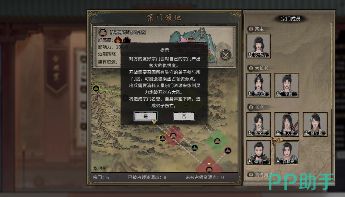 在玩家创立宗门之后,建立是抛光养晦一段时间,当影响力已经达到了十万点以上时,玩家可以率先挑战附近的冷门宗派,例如影响力为零的宗派,在大地图上面是不会显示势力范围的,玩家可以率先进行劝降,不战而胜。