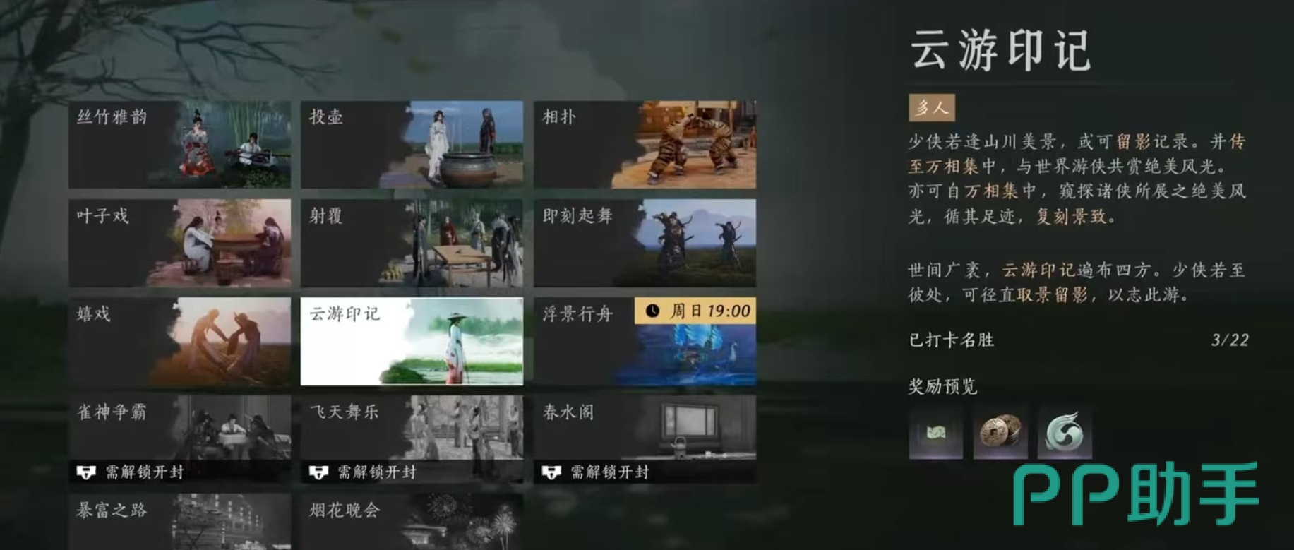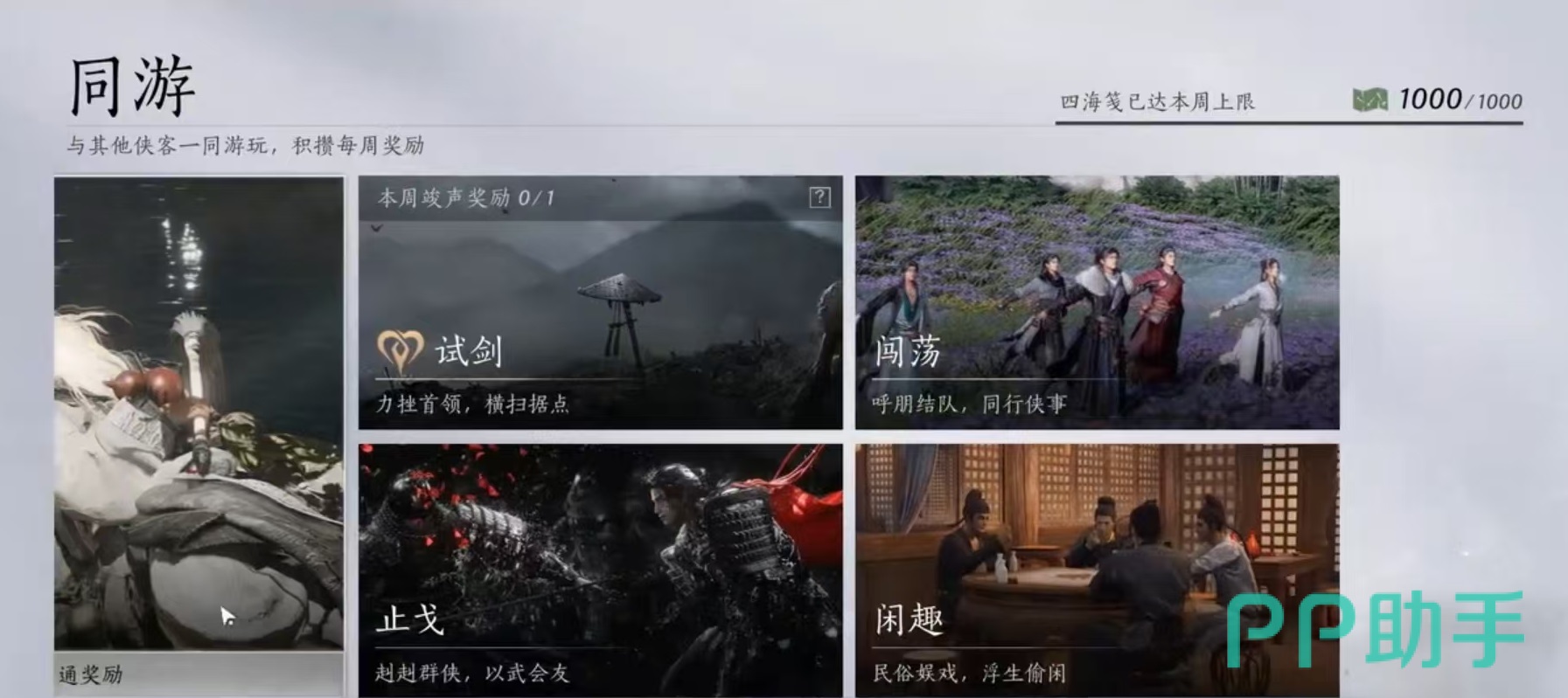 首先大家打开游戏的主页面,在页面中找到同游功能,同游是指玩家可以和其他侠客一起游玩,积攒每周奖励,也是社交活动中一项比较重要的设定。在同游中有多项内容,包括侠境,试剑、闯荡、止戈和闲趣等一系列选项,找到其中的闲趣,就可以看到诸多的闲趣活动。大家比较熟悉的丝竹雅韵、投壶等都在这里,拉到下方就可以在中间偏下的位置看到云游印记这项活动。